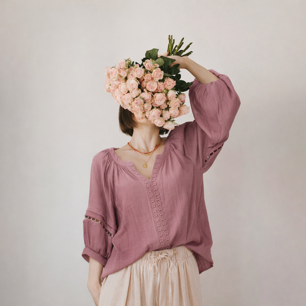 PAPAYA GAUZE SPLIT NECK CROCHET RUFFLE DOLMAN